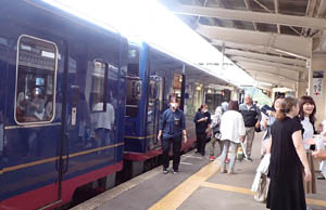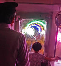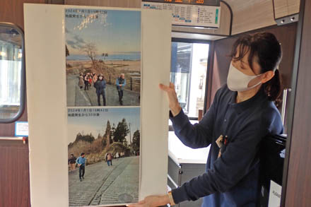 能登半島地震から1年10か月の2025年10月18日、石川県の七尾市と穴水町を結ぶのと鉄道の「震災語り部列車」に乗車。震災の爪跡も残る風景を眺めながら、発生時に列車に乗っていて乗客を避難誘導した女性乗務員の生の話を聴いた。 女性乗務員が語るあの時、その後 北陸新幹線の金沢ー敦賀間開通で敦賀乗り換えが必要となり、面倒になったJR西で金沢へ、そこから七尾線に乗り換えて七尾駅着。ここで9時58分発の「語り部列車」に乗車した。先頭車両が里山号、二両目が里海号、三両目は一般車両。里山、里海号には山側、海側に向いた席もあり、当方は予約通り里海号の海向きの席に座った。◇乗客48人を丘の廃校に誘導、余震の中一夜 「語り部」は能登半島地震が起きた時に観光列車に乗っていた女性乗務員3人。メインの方が里山号でずっと話すが、サブの人も近くでパネルなどで丁寧に説明してくれる。 和倉温泉の次の駅は「田鶴浜」。精緻な技で知られる建具屋さんが集まる街という。「震災後も、この車両の仕切り壁に組子細工を作ってもらっています。カニや貝の海の生き物の絵は輪島塗の白漆で仕上げています」と教えてもらった=写真左下。 ◇乗客48人を丘の廃校に誘導、余震の中一夜 4駅目の能登中島駅は、2024年1月1日午後4時6分、ここで停車中地震が発生した場所。4分後に最大震度7の激しい揺れが起き、乗客48人を降ろして駅前広場に誘導した。「直後に大津波警報のアナウンスが流れ、92歳の方を含め全員で駅前の丘にある廃校の体育館まで上がりました。ポリ袋を使ってトイレができるようにし、余震が続く中一夜を過ごしました、朝6時半の夜明けとともに外でラジオ体操、近所の人が炊き出しをしてくれました」と緊迫の二日間を語った=写真左上。次の西岸駅前手前から内海の七尾湾が広がっている。湾には名産の牡蠣の筏が浮かび、震災1年半を経て再開通した能登島を結ぶ「ツインブリッジのと」が見える=写真右上。その向こうにはうっすらと立山の稜線が望める。 ![]() ◇「新学期には列車通学」3か月で全線再開 穴水町に入ると、海面にかつてボラを獲るため建てたボラ待ち櫓=写真右中。一方、海辺には津波で崩れたままの家が目立つ。沿線の家の横から両手を挙げて大きく振るおばあさんがいた。「えっちゃんばあちゃんです。90歳で、毎日出て来られます」。こちらも思いっきり手を振り返した。 ![]() 沿線の四季をイメージしたイルミネーションが輝くトンネル=写真左=を抜け、終点穴水駅に10時50分到着した=写真下。 能登半島で唯一残った鉄路・七尾〜穴水間33.4kmを走る「のと鉄道」。地震で大きな被害が出て全面運休した。しかし、「新学期には列車で通学できるように」と復旧に取り組んだという。語り部さんは「折れ曲がった線路を見ると、とても再開はできず、会社もなくなって私達も仕事を失うと思っていました。皆さんの応援で4月6日に全線運行再開の列車が走った時は、本当に嬉しかったです」と振り返っていた。◇「駅前でくつろげる場を」全壊の喫茶店再建 穴水駅前で震災で全壊後再建した喫茶店=写真欄外=で昼ごはん。全壊したが「また駅前で飲食し、くつろげる場所を」という声を受けて再建し、ユニークな外観と昭和レトロの内装の店が甦った。メニューもいろいろ、独自の味のエビカレーとスープカレーラーメンを賞味した。冬は七尾湾で獲れる牡蠣を使ったカキカレーも味わえるそうだ。この日は夕方に金沢で会合があったため、穴水ではゆっくりできず12時10分発の一般車両で折り返した。一般車両でも車掌さんがポイントを案内、能登中島駅で停車した状態で保存されている鉄道郵便車を教えてくれた。短いながら中身の濃い鉄旅だった。 (文・写真 小泉 清) ⇒トップページへ |